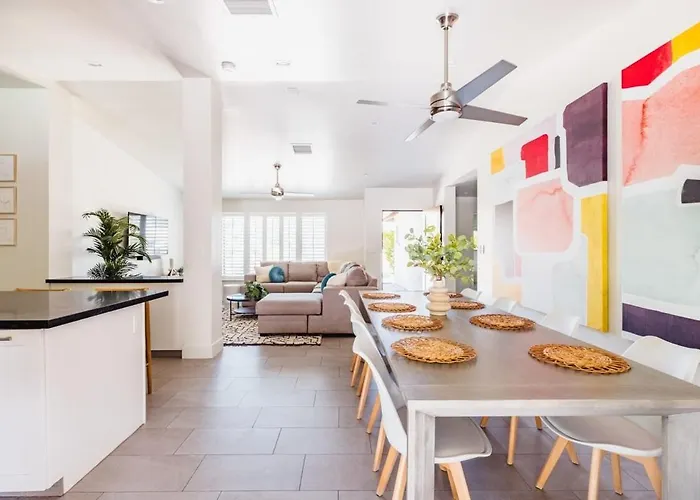 Eine komplette Küche in der Villa Heated Pool Outdoor Kitchen Patio Modern Design bietet alles, was man braucht, darunter ein Wasserkocher, ein Kühlschrank und ein Herd. Im Restaurant Vecina, das ca. 1 km von hier entfernt liegt, können Gäste leckere Gerichte genießen. Der Flughafen Phoenix Sky Harbor International liegt 5 km von dieser Unterkunft entfernt und ist zudem leicht zu erreichen.